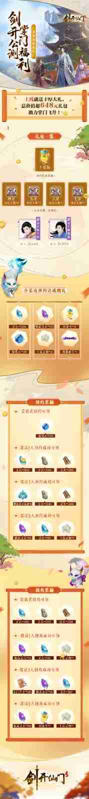 游戏为大家准备了海量的福利,,,包括上线即可获得的全渠道预约礼包、、、、十连抽等福利,,,输入密令“JK666”、、、“JK888”即可领取紫色弟子,,,,达到金丹期后还有功法宝箱可领,,,,助力全宗上下实力提升……所有奖励总价值超过648元,,,,而邀请好友一起体验,,,,更可以获得额外的奖励哦~